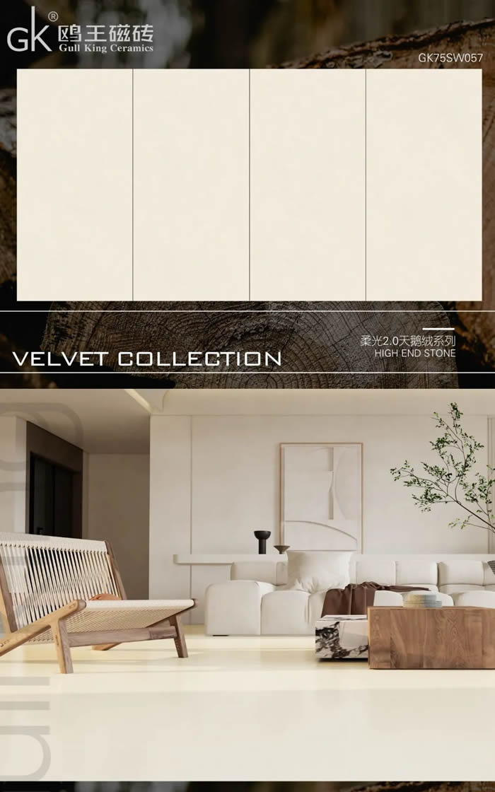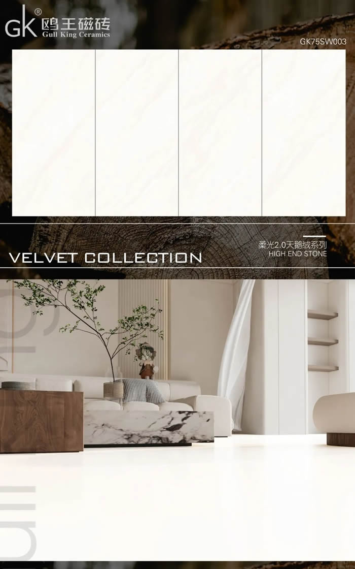 03.柔光2.0天鵝絨采用了全新的工藝,其裸露的美感讓人不禁心生向往。多種釉料材料和多重工藝巧妙融合,質(zhì)感溫潤、手感細(xì)膩。鷗王磁磚其獨(dú)特之處在于,運(yùn)用了天然石材的紋理,并通過藝術(shù)重構(gòu)組合,呈現(xiàn)出簡潔、清新、純粹、自然的美感,為人們帶來了一種特殊的溫柔感、時(shí)尚精致、大方優(yōu)雅,讓人沉醉其中。
